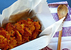 Instead of sweet potato pie, try these sweet potato butternut squash latkes. You’ll get the flavors of Thanksgiving but the crispy fried texture of Chanukah.